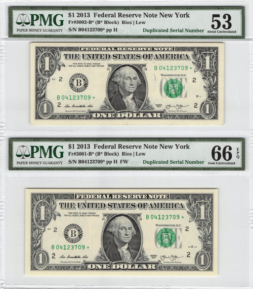 2013 B Duplicate Star Note Error One Dollar Bill B04422405* 66 EPQ FW